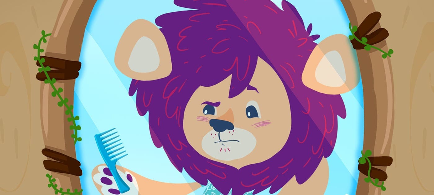 Kamalu em frente ao espelho cuidando de sua linda juba roxa e explorando alguns penteados diversos até encontrar seu estilo próprio. Uma forma alegre e descontraída de mostrar diversidade e estilos diferentes.